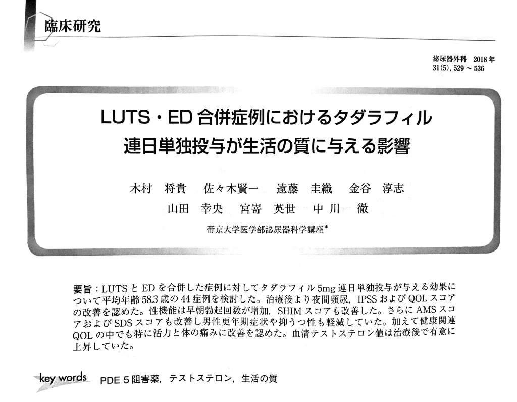 前立腺肥大症と勃起障害を合併した方に対して、タダラフィル(ザルティア)を連日投与したところ、テストステロンが上昇しQuality of life(QOL)が改善したという論文です。