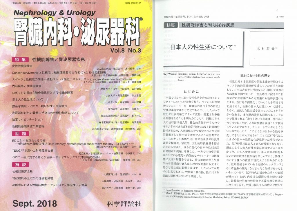 科学評論社「腎臓内科・泌尿器科 vol.8 No3」に掲載されました 2018/11/26 日本人の性生活について、腎臓内科・泌尿器科の特集記事に掲載されたのでご紹介します。 日本人の性生活について日常診療でわれわれが知り、また考えなくてはならない問題を提起、考察することを試みた論文です。日本における性の歴史から、現代日本の性生活(若い世代の性・セックスレス)、性機能と性生活についてまとめました。性機能外来を受診された患者さんに別刷をお渡しして、感想をきいているところです。