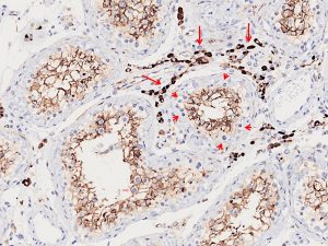 この写真はコロナに感染し死亡した症例の精巣をCOVID-19の標的であるACE2で染色した病理写真です。ACE2は精細管の細胞に分布しています。従って精巣はコロナウイルスの標的となり、感染することで精巣組織に損傷を起こすことが想像できます。