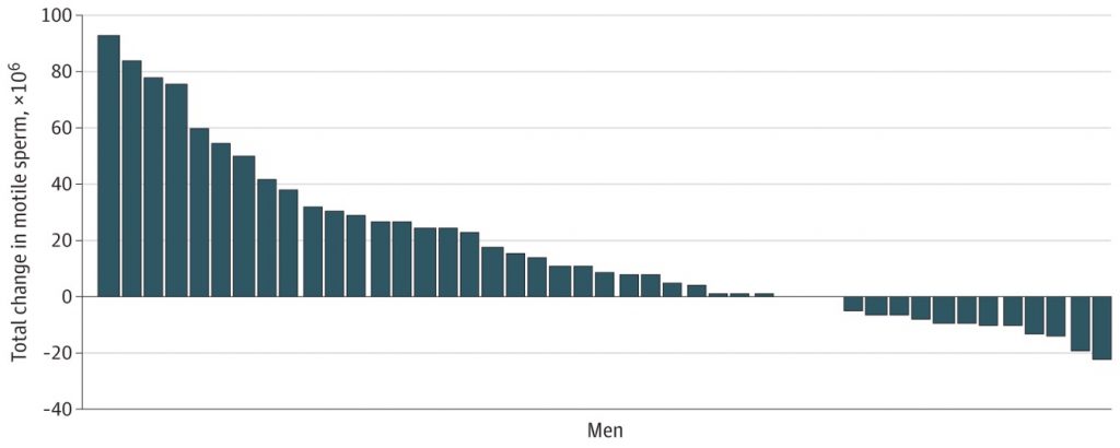 次の図はCOVID-19ワクチン接種前後の参加者45人の総運動精子数パラメータの変化を示すウォーターフォールプロットです。棒グラフが0より上に伸びていると改善しているし、0より下だと悪化していることがわかります。全体的には上昇に傾いていますね。