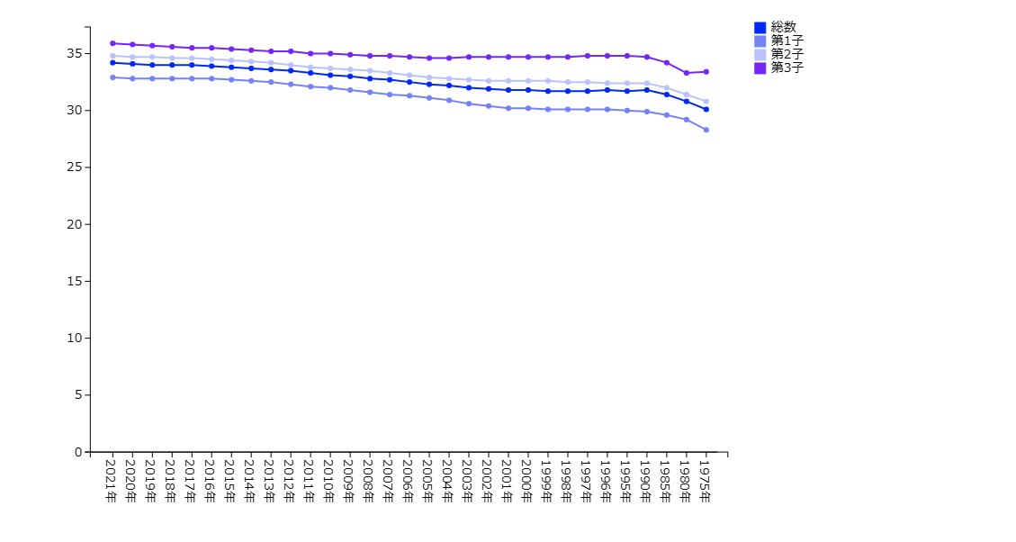 人口動態調査 人口動態統計 確定数 出生上巻 4-19 出生順位別にみた年次別父・母の平均年齢 | 統計表・グラフ表示 | 政府統計の総合窓口 (e-stat.go.jp)