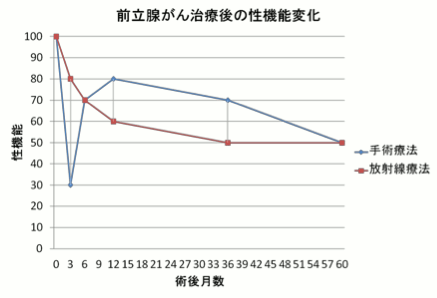前立腺の手術では、勃起神経を温存できた場合は性機能がある程度もとに戻る症例が散見されますが、放射線治療をした方では放射線前後のホルモン治療の影響も相まって、長期的にみると多くの症例で性機能障害を認めます。個々の症例のことなので一概には言えませんが(平均化された上の図では表しにくい)、性機能の温存に重きを置くならば、熟練した術者が行うロボット手術で勃起神経を温存できた場合、手術のほうが放射線治療よりも勃起機能を保てるチャンスがあるかもしれません。放射線治療でも、外照射や密封小線源療法単独か、それにホルモン治療を加えるかによっても性機能の変化は異なります、特に、ホルモン治療では性欲が著しく減退しますので、そのようなことを気にする方はご相談が必要です。いずれにしても治療前に主治医とよく相談することが重要です。