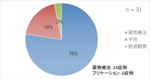 治療方法は薬物療法24例(78%)、手術療法6例(19%)、無治療経過観察1例(3%)であった。