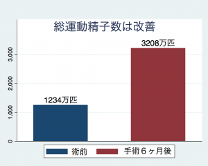ただしこのトピックに関してはいまだ統一された見解はないので今後の更なる研究が必要でしょう。以下のグラフは当院での顕微鏡下低位結紮術のデータです。手術3ヶ月で改善の傾向を認め、6ヶ月では明らかに精子濃度や運動率が改善しています。