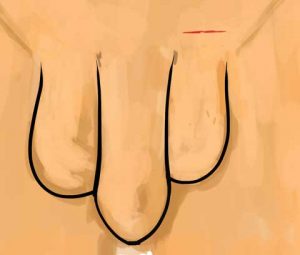 当院ではすべての症例で顕微鏡下精索静脈瘤低位結紮術を局所麻酔もしくは全身麻酔で行っています。この方法は顕微鏡手術のトレーニングが必要であり高度な技術が必要であり実施可能な施設が限られます。局所麻酔でも皮下麻酔、精索ブロック注射によって痛みは完全に無くなりますが、手術中に睾丸が引っ張られるような違和感があります。皮膚切開の場所は図のように足の付け根あたりから少し上の場所を2.5㎝程なので、手術後に傷は陰毛に隠れて目立たなくなります。