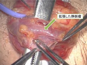 手術では切開創から精索を持ち上げて、顕微鏡下で細かい静脈を結紮し、動脈、リンパ管を温存します。動脈を可能な限り温存するため手術中には超音波ドップラー血流計を使用しています。