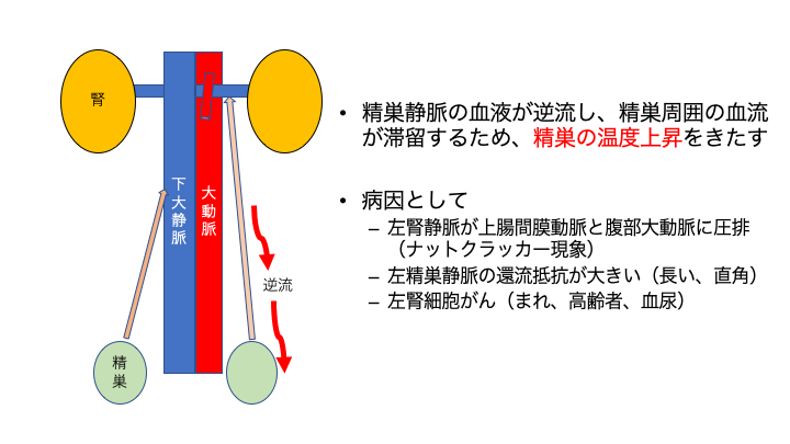 精索静脈瘤はその解剖的な理由から、左側に多く発生するといわれています [4-6]。その主な原因の一つは、精巣静脈の走行にあります。左側は左腎静脈に直角の角度で流入し、その経路が右側より長いため逆流が生じやすいとされています[4-6]。このため精巣静脈の血液がよどむため、精巣の温度の上昇や[7, 8]、酸化ストレスの増加[9-14]、カテコラミン等のホルモンの濃縮が起こり、精巣が精子を作る機能を弱めるという説が有力です。興味深いことに、片方の静脈瘤でも、両側の精巣の温度が上昇し、両側性に障害をきたすとされています[15]。