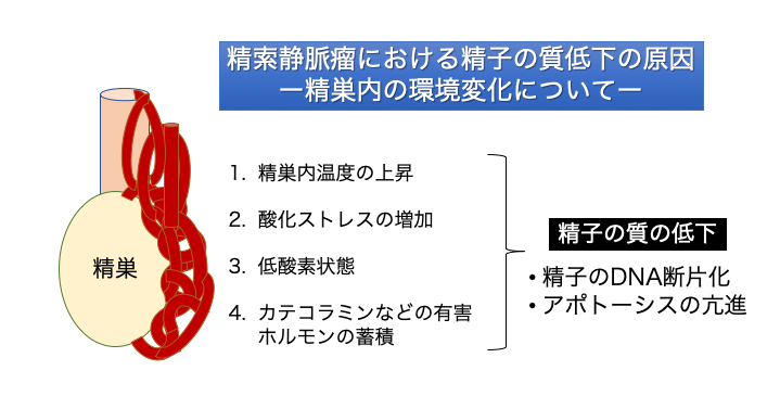精索静脈瘤により発生する精巣への障害を考えるとき、酸化ストレスが重要な役割を果たしています[9-14]。酸化ストレスは活性酸素と抗酸化作用のバランスが崩れることにより、発生します。多くの実験で、精巣における過剰な酸化ストレスと抗酸化作用の低下が、精子を作る働きを邪魔すると報告しています[14, 16]。さらには酸化ストレスの上昇がゲノムとミトコンドリアDNAの破壊を引き起こし、最終的には精子を形成する働きを担うメカニズムに影響を及ぼすとされています[17]。最近、精索静脈瘤の手術がこのようなDNA障害を軽減するという報告がでています[18, 19]。